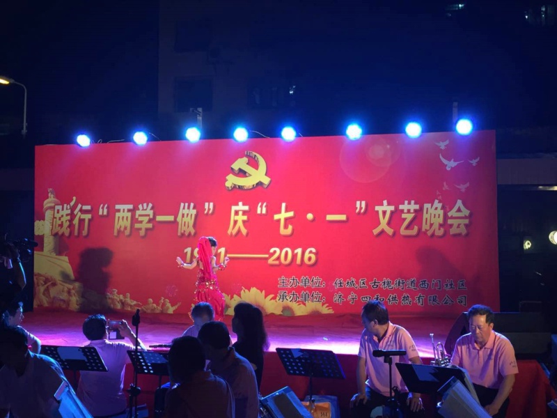 為紀(jì)念中國共產(chǎn)黨成立95周年,進一步激發(fā)基層黨組織活力,促進和諧社企建設(shè),展示社區(qū)濃厚的文化氛圍和企業(yè)關(guān)愛民生的責(zé)任擔(dān)當(dāng),由任城區(qū)古槐街道西門社區(qū)主辦,濟寧四和供熱有限公司承辦的“踐行‘兩學(xué)一做’慶‘七·一’”主題文藝晚會在光明健身廣場隆重舉行,四和供熱公司演職人員同廣大黨員群眾一起載歌載舞共迎黨的生日。