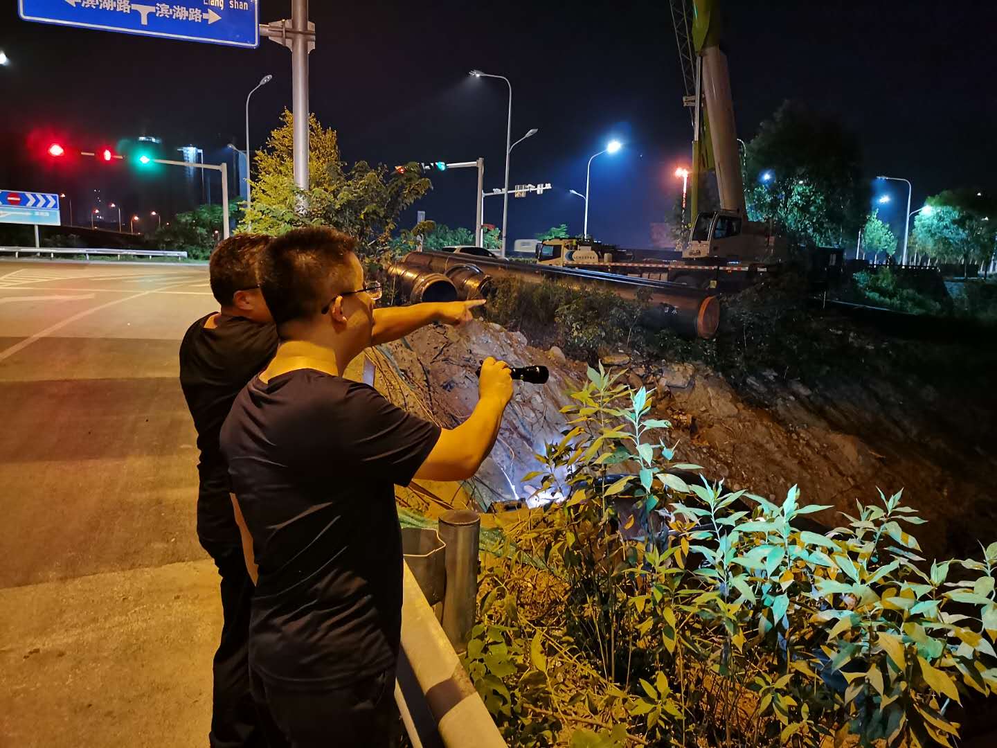 鄧剛先后視察了管網(wǎng)施工第六標段、頂管過地表水超采、頂管過火頭灣大橋、頂管過S321公路等5處頂管施工現(xiàn)場。時至23:40分,在頂管過南躍進溝工作井施工現(xiàn)場,數(shù)名施工人員挑燈夜戰(zhàn),正進行頂管軌道焊接安裝和設(shè)備調(diào)試工作,夜燈下的身影在工地上來往奔波,現(xiàn)場到處是搶抓工期的干勁與熱情。